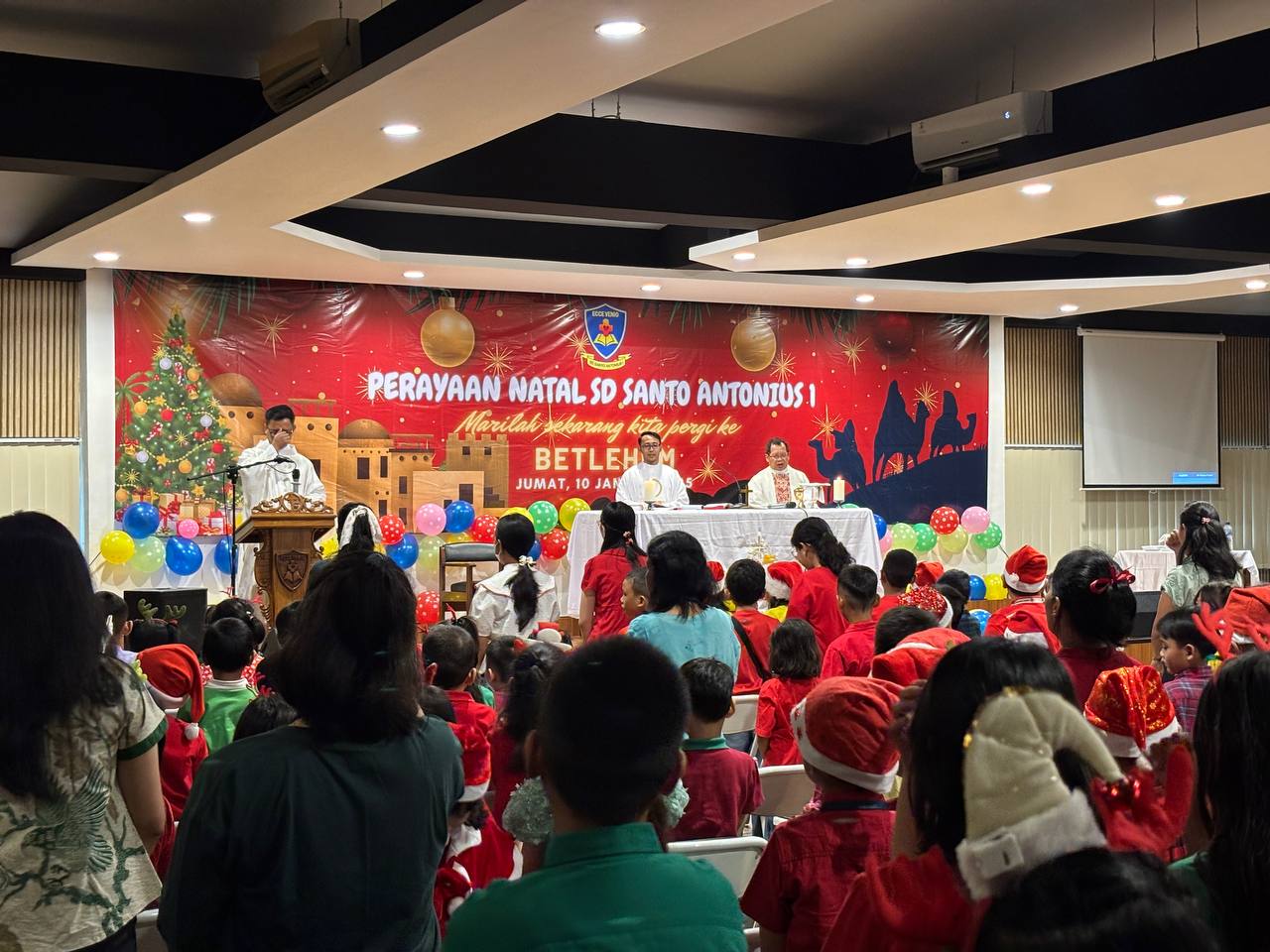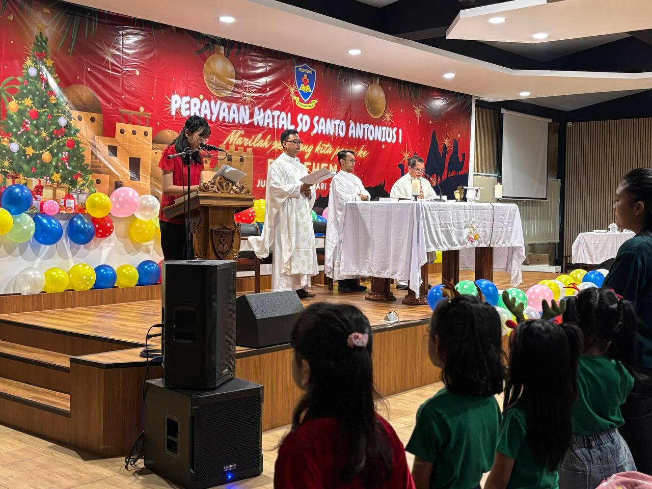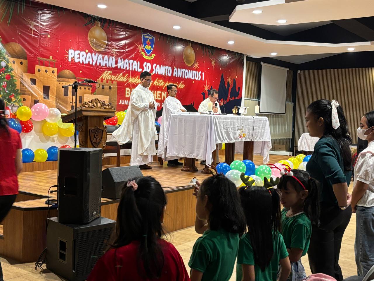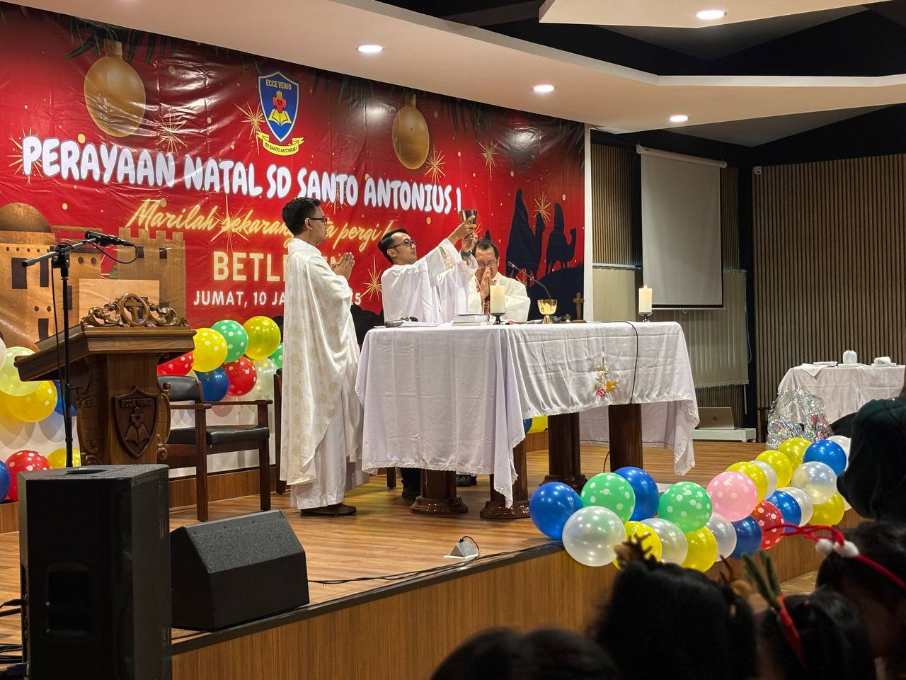 Perayaan Natal di SD Santo Antonius diawali dengan misa yang dipimpin oleh tiga imam, yaitu Rm. Edi Setiawan SCJ, Rm. Ignatius Trisna Setiadi SCJ, dan Rm. Blasius Sumaryo SCJ. Dalam homilinya, Rm. Edi menyampaikan tema perayaan Natal dan Tahun Baru, "Marilah sekarang kita pergi ke Betlehem." Rm. menjelaskan bahwa Santo Antonius adalah Betlehem kita, tempat di mana sukacita dan kedamaian hadir, tempat kita bertumbuh dan berkembang menjadi pribadi yang besar, seperti yang tercermin dalam teladan para bapak dan ibu guru.